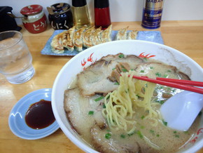 食べてみると見た目と違い意外とにアッサリとした豚骨スープに若干太めの柔らかな麺で私好み!餃子もサッパリとしてヘルシーな感じの物であっという間に完食をしてしまいました!