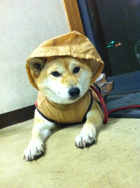 暴風雨でガサつく外の雰囲気にビビリながらもしっかりと!?雨対策のカッパを着て行く気満々だったのですが出発をして歩き出すと傘は裏返り一人と一匹でびしょ濡れ!