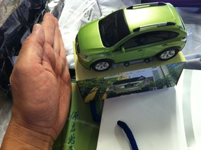 今回試乗をした車と同じ色のこのXVハイブリットのミニカー!なんと今回はぶつからないだけでなくヘッドライトが点灯しぶつからない瞬間!?にブレーキランプが点灯!!