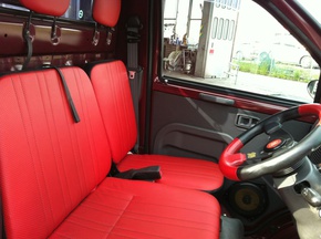 内装はこんな感じでシートを赤黒のコンビカラーに仕上げてあります! それに合わせてハンドルも同色の物に!