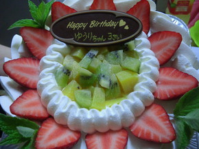 とてもキレイなデコレーションケーキは孫っち達も大喜び! 食べる前にハッピーバースディの歌を皆で歌い「たった3本!」のろうそくの火を孫っちは「二息!」で消す事が出来ました!