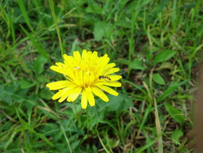 もう人間がずっと前から見ていて慣れてしまった感じのタンポポに小さな蜂!?が食事に来ていました!(恐らく!)