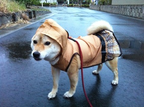 保護をしてからかれこれ一月半となる迷い犬の横音(ヨコネ)が遂に雨の散歩でカッパを着る事となりました!