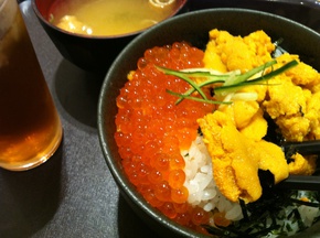 実はここの「ウニイクラ丼」は新鮮なイクラとウニが酢飯にタップリとのっている私の大好物なのです!出発前に会社の時計は閉店の9時まで残り30分となっていたので恐る恐るお店に行くと9時までに食べ終われそうだと解ったご主人さんが急いで「ウニイクラ丼」を作ってくれました!