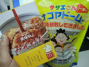 今回は先日のプロ野球オープン戦に行って来たというTくんが「サザエさん一家がナゴヤドームで野球を観戦してきました。」と言う「礒野家ファミリーケーキ メープル風味」と言うお菓子と!