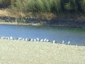 この写真は今日の日中に簡単な出張に行った時に見掛けたのですがおそらく白サギだと思われる鳥と、全く色の逆な少しサギより小さな黒い鳥がキレイに並んでいるではありませんか!