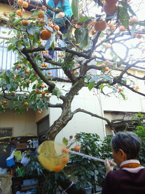 そして器用に柿の実を採った若女将さんが木の上からストンとその実を下に落とすと、そこには手馴れた感じで柿の実を網でキャッチする大女将さんの姿がありました!