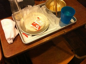 「ミルメーク」を牛乳に混ぜソフト麺の袋を開け、いよいよ2種類のソースの入った器に入れようとすると先生からすトップが掛かりました・・・・・・