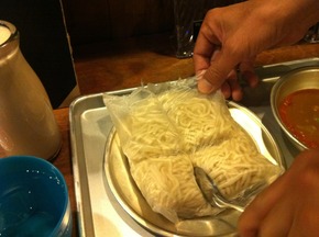 そしてその4等分した麺を1つずつ小さな器の中に入れて行くと言うことで、一度に入れて麺にソースが上手く絡まなくなる事を防ぐのです!