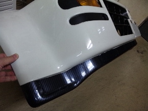 バンパーのエンジン冷却の為の開口部とウインカーの周りの凹の部分をつや消しの黒で塗り、一体成型ではありますがあえて後着けで取り付けたカーボンのスポイラーの様にバンパーの一番下の部分に丁寧にカーボン調のフィルムをドライヤーであぶりながら貼って見ました。