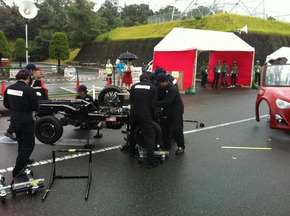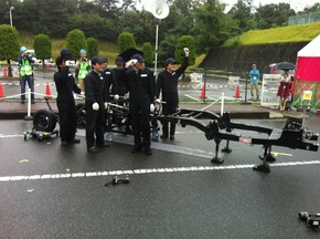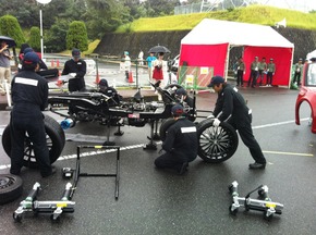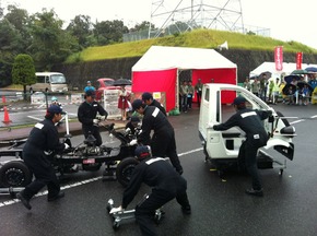 お姉さんの「さあミゼットIIが変身しますよ~」の爽やかな紹介のあと技術会のメンバーの方々の作業が掛け声と共に始まりました!