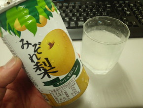 「あの大好きな梨の雰囲気が缶ジュースで味わえるのか??」などと思ったりしながらコップに注ぐと予想通り小さな果肉の入った透き通った飲み物でした。