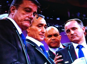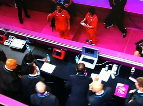コーチ達の抗議により審判団がモニターをもう一度見ながら内村選手の動きを確認します・・・・・・