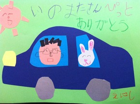 紺の車に私とぴっとが乗っている絵で、とても細かい所まで丁寧に書いてくれてあり、そこに笑顔の太陽が光を注いでくれています!