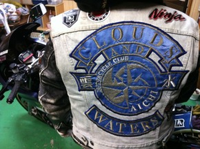 彼はもう70000キロとなるNINJAと共に気の合った仲間と「70000キロ前」につくったハンドメイドの刺繍の看板を背負っている。
