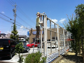 そして乾いた後は新しい看板の下地となる板を骨組みに着けて行きます。