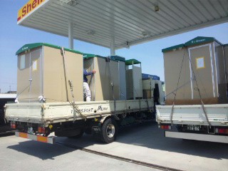 仕事で掛川に行く途中、前を走っているトラックが仮設トイレらしき物を運んでいました。