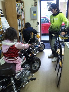 息子さんのHくんと娘さんのYちゃんが嬉しそうに並べてあるMONKEYにまたがり横でお父さんのエリーの兄さんが心配そうな顔をしながらも部品の説明をしたりエンジン音をマネたりしながらとても楽しそうに見えました♪