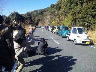 私が先頭でみっちゃんが最後尾。 前からふり返っても後ろから眺めて見ても25台程のミゼットIIが繋がっている姿は何度見ても迫力満点で笑っちゃいます!