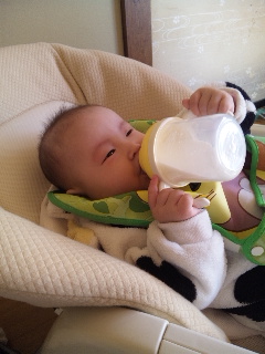 離乳食にもチャレンジの日々が続いていますがまだまだミルクを飲んでいます。