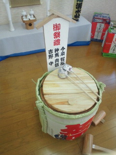 この写真は今年の南町・湧水社の社長を務めるブログ☆☆Sky Wing☆☆でお馴染みのともっちの目出度い町内の出発前の鏡開きを待つ樽酒の様子。