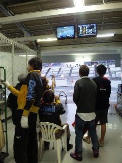 これは他のクラスのレース中にモニターとラップチャートを見ている太郎選手のチームの方々。