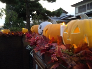 お化けをイメージしてくり抜かれたらしいカボチャの飾りとろうそくが15個位でしょうか、家の塀をグルリと飾っていました。