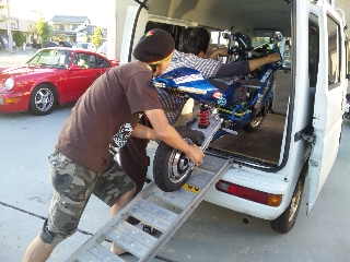 試乗後にhiro-bpnさんとがっこーさんでトランポに積み込んでいる姿を見ていたらなんだかサーキットにいるような雰囲気になりました!