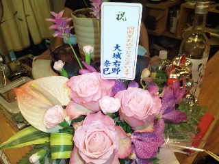カウンターの前には先日私が沖縄に車を納車したOちゃん夫婦よりお祝いの花が届いていました!