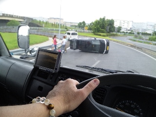 そんな中、不動になっている車を運ぶ為に高速を使いキャリアカーで浜松に行った時、インターから道路に出るためのループになっている道路で縁石に乗り上げてしまった為か横転している軽自動車がありました。