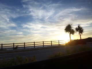 ゆっくりと夕日でも見たかったのですが、彼の仲間が街中で居酒屋を営んでおり、何と沖縄料理を御馳走してくれると言う事もあり、車の中から今回の沖縄では一回しか見る事の出来なかった夕日を見ながら先を急ぎました!