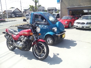 とのりんさんはミゼットIIもえぎスペシャル!マスターは最近ちょくちょく乗っている事の多いワインのホンダCB750FBで心地よいマフラーの音と共に来てくれて、一瞬にして車とバイク談義に花が咲きました!