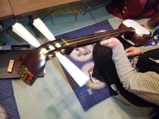 三味線にも色々な種類とこだわりがあり、この三味線は皮が犬で白い部分のパーツは象牙、握る部分は太いタイプの物で金額は100万円を越えるそうです!
