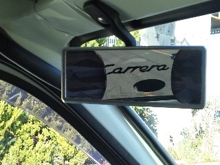 ガラスの外側に貼ってあるこのポルシェの本物のカレラの文字は、本来室内からは裏になって見えるんですが、ミラーのおかげでまた正しくCARRERAと写ります!