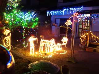 さらに庭には立体的に首の動く鹿の形をした飾り物や、やはり実際に動いているシーソーに乗って遊ぶこびとか妖精の様な飾り物も置かれたりと、とても小学生の息子さんが組み上げて飾り付けをしたとは思えないくらいの素晴らしさです!