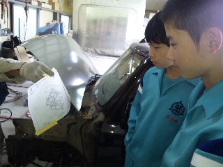 その後は自動車整備の中での「職人」の板金屋さんの見学です!磐田の皆さん優しい板金屋さんの鈴協自動車板金さんに許可を得て3人で伺いました。