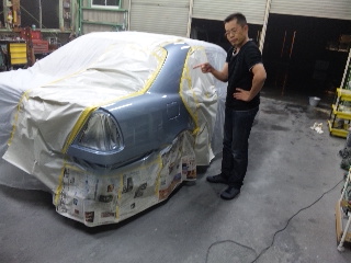 しかしまだまだこれからもう一仕事!このベンツはメタリック塗装といい、一度目に塗った水色には細かな金属粉が入っていて極端に言うと表面がザラザラとしてしまうんです。