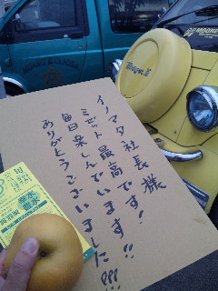 そして従業員さんが持って来てくれ手元に届いたのは美味しそうな沢山の梨の豊水と頑丈で特大の温かな便り‥‥これが私の仕事をしている中での最高に嬉しい瞬間!
