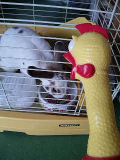 かじる為の木を買ってあげた時にもかじらず、遊ぶ為のボールを高かったのに頑張って買ってあげた時にも遊ばず、寒いからと思い買ってあげた牧草の家も一晩で半壊状態・・‥・・