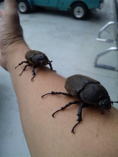 今日お客様の車を移動すると、夜に水銀灯に来たと思われるカブトムシの女の子のが今度は二匹も現れました!