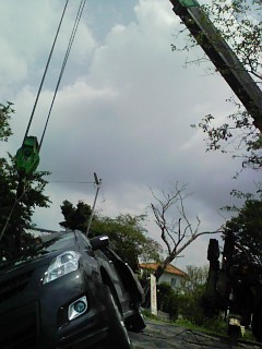 慎重に作戦の実行です・・・・車が少しずつ作戦通りにレッカーで浮き上がりもう一台のキャリアカーでゆっくりと後ろに