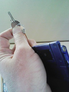 携帯電話の先に事務所の鍵が着いており携帯電話を持たないと事務所の鍵が締めれない様にしてありました!これなら携帯電話を 忘れる事はできませんよね!(笑)