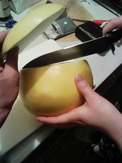 わにちゃんに聞いたところこれは「晩白柚」と言い実家のある九州から送って貰ったとの事で包丁を入れても中々実が出てきません!