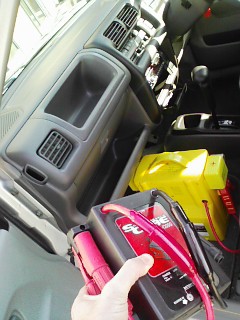 私の左手に持っている黒い箱は緊急時にエンジンを始動するためのブースター! これ一つで今までバッテリー同士をブースターケーブルでつないだりしていためんどくさい作業がなくなったんです。 便利な時代です!