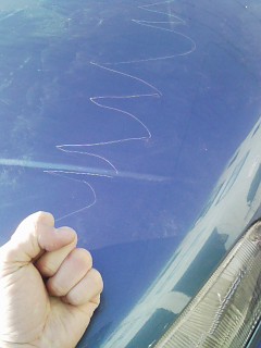 人目も気にせずゆっくりとボンネットをキャンバスに見立て描かれたキズ・・・・悲しいかな悪意を持ってやった事ではなさそうです。