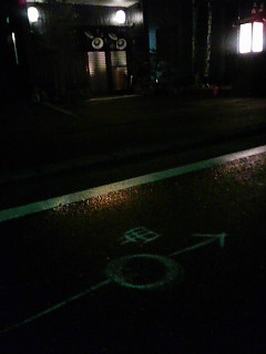inoさん元気。今日逢ったばかりでしたっけ。。。。。ところで、このマークは水道管の工事の為の印だと思うよ。この新町は、古くからの水道管が、店の南側に埋められています。もう何十年と経っているので交換の時期に来ているようです。そこで、水道管を新設するため、北側の道路脇を現在工事しています。(曲)の印は、店の前でどちらかへ曲がると言う印の様です。何れにしろ、新しい水道管が近いうちに出来上がります。美味しい水か飲めますように。。。。。。