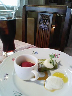 今日はカシスのシャーベットに抹茶のケーキさらには・・・・・甘党の私も大満足!
