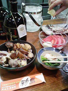 まずは芋焼酎のロックとあさりの酒蒸しでスタート!