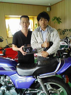 4台のバイクのミニチュアのプレゼントを持って!良く見ると昨日も電話で話した北川君のWSBのマシンや私の仲の良い監督さんの8耐優勝マシンまで!