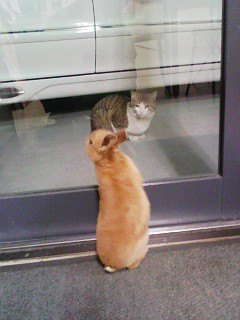 毎日元気に育っているウサギのピピ。 最近私の店の中で遊んでいると近所の今まで素通りしていた猫達が遊びに来ます。